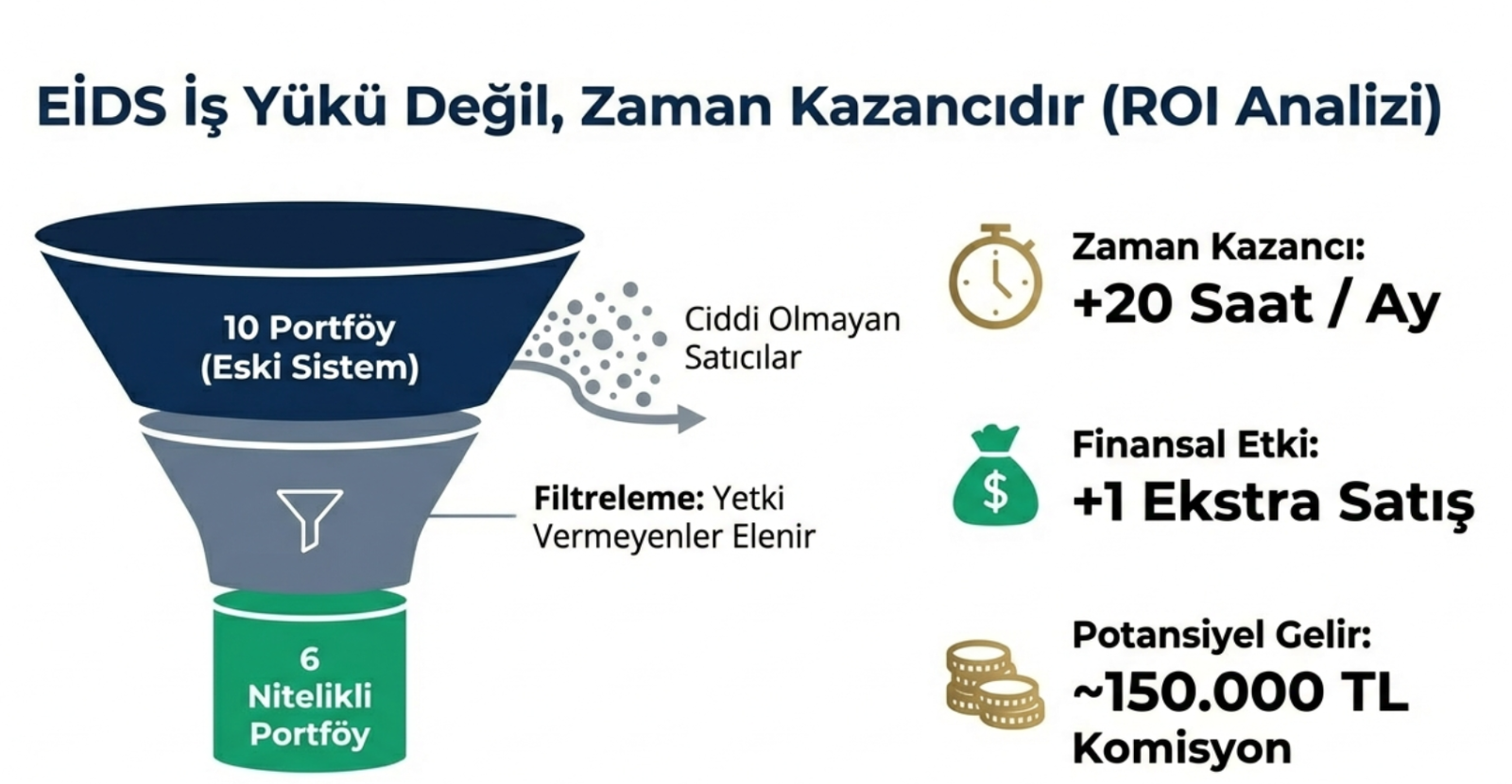 - EİDS Sistemi: Yetki vermeyen (yani ciddi olmayan) satıcı baştan elenir. Kalan 6 nitelikli portföye odaklanılır.