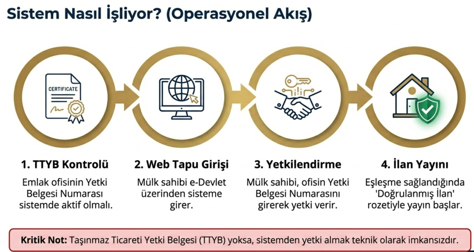 Sistem temel olarak tapu kaydı ile ilan verenin kimliğini eşleştirme prensibine dayanıyor. Süreç, mülk sahibinin e-Devlet (Web Tapu) üzerinden emlak ofisine "yetki vermesi" ile başlıyor.
