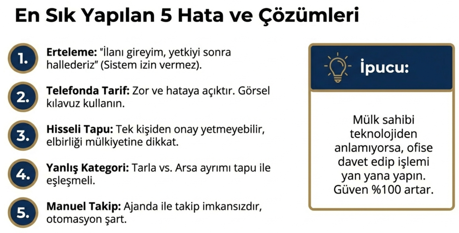 | Yetki Belgesiz İlan | İlan platformları ilanı onaylamaz/yayınlamaz. | Portföy pazarlanamaz, ciro kaybı. |