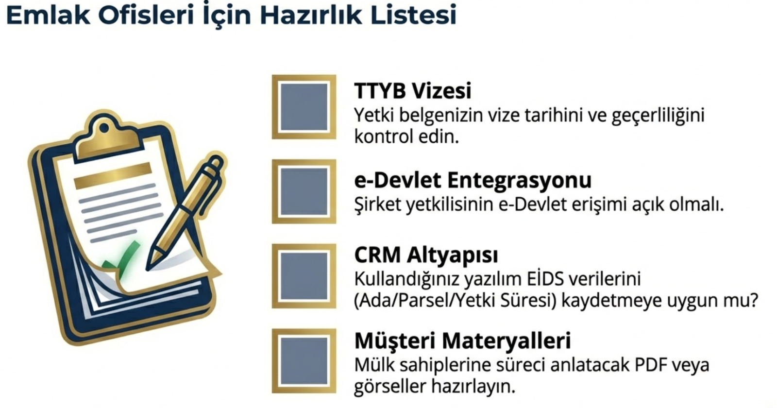 - CRM Güncellemesi: Kullandığınız emlak CRM programı altyapısının EİDS verilerini (Ada/Parsel/Yetki Süresi) kaydetmeye uygun olup olmadığını denetleyin.