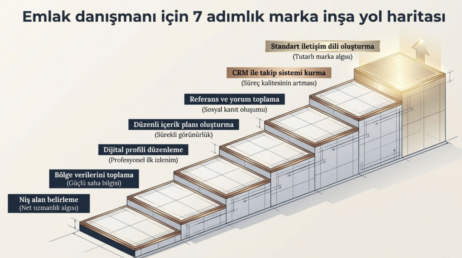 Emlak danışmanının marka haline gelmesi, tek seferlik bir görünürlük çalışması değildir. Bu süreç; uzmanlık alanının netleştirilmesi, bölge bilgisinin derinleştirilmesi, dijital vitrinin düzenlenmesi, içerik üretiminin sistemli hale getirilmesi, iletişim dilinin kurumsallaştırılması ve müşteri takibinin disipline edilmesiyle güçlenir.