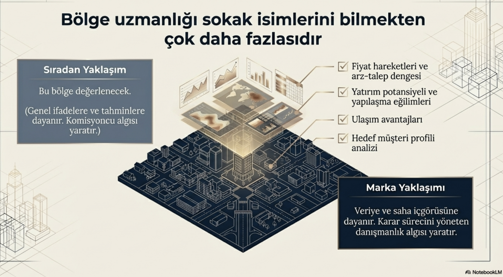Sıradan yaklaşım genel ifadeler kullanır. Güçlü marka yaklaşımı ise veriye ve saha içgörüsüne dayanır. Örneğin “bu bölge değerlenecek” demek yerine, bölgede son dönemde hangi ürün tiplerinin daha hızlı talep gördüğünü, hangi sokakların farklılaştığını ve hangi yatırım profilinin burada daha aktif olduğunu anlatabilmek gerekir. Bu fark, müşteri gözünde komisyon algısından danışmanlık algısına geçişi sağlar.
