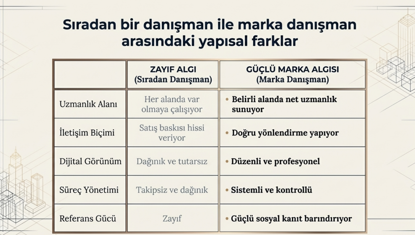 Tanınıyor olmak tek başına yeterli değildir. Bazı danışmanlar dijitalde daha görünür olabilir; ancak bu durum güçlü marka algısı oluşturdukları anlamına gelmez. Güçlü marka, görünürlük ile birlikte güven, uzmanlık ve tutarlılık üretebilmeyi gerektirir.