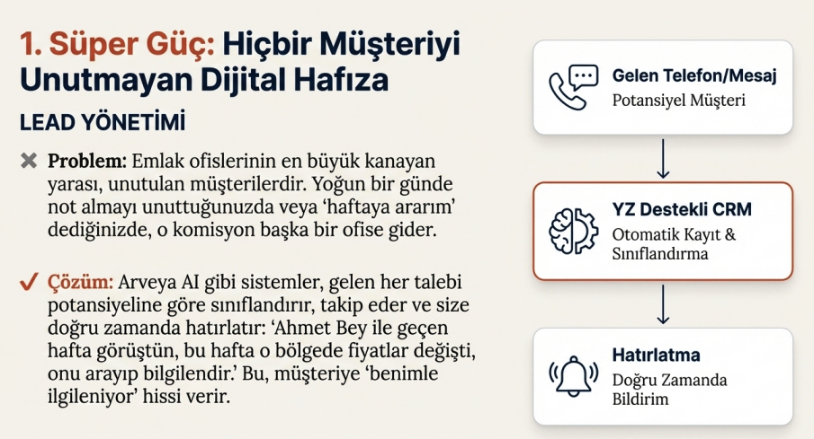 Arveya AI gibi sistemler burada devreye girer ve size "unutma lüksünü" unutturur. Gelen her talebi (lead), potansiyeline göre sınıflandırır. Sadece kaydetmekle kalmaz, size hatırlatır: "Ahmet Bey ile geçen hafta görüştün, bu hafta o bölgede fiyatlar değişti, onu arayıp bilgilendir." Bu, müşteriye "benimle ilgileniyor" hissi verir ve sadakati artırır.