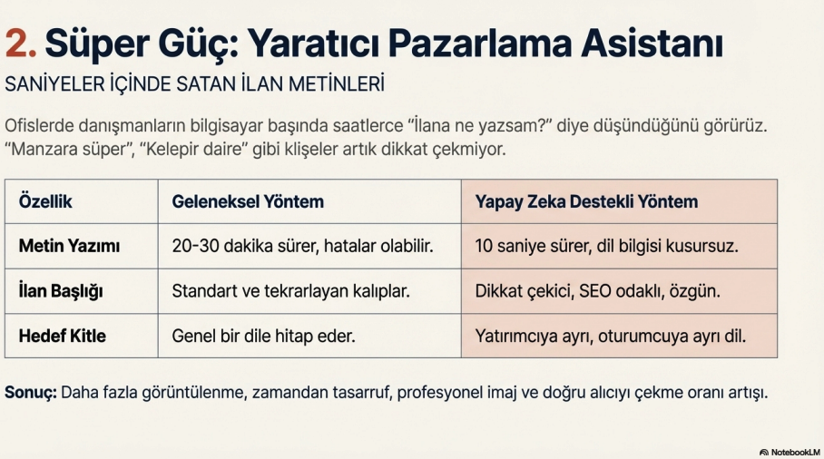 Yapay zeka modülleri, mülkün özelliklerini (3+1, güney cephe, metroya yakın) girdiğinizde size saniyeler içinde, SEO uyumlu, alıcının duygularına hitap eden ve tıklanma oranı yüksek metinler hazırlar. Siz 30 dakikada bir ilan metni yazarken, yapay zeka 30 saniyede 5 farklı alternatif sunar.
