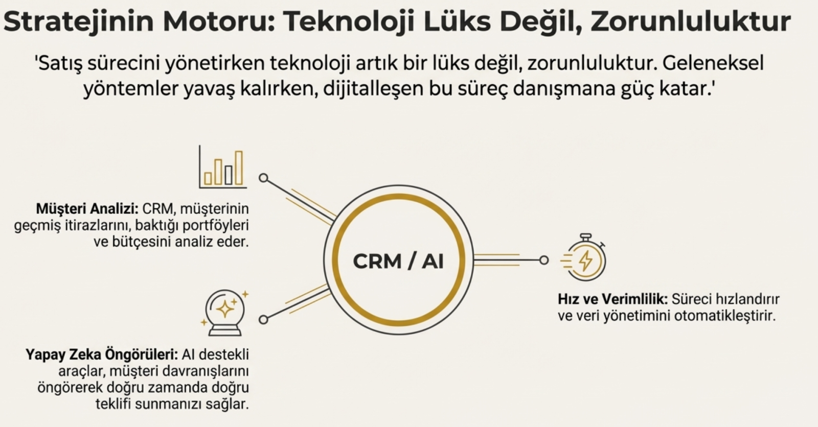CRM sistemleri sayesinde müşterinin geçmiş itirazları, baktığı portföyler ve bütçe aralığı analiz edilir. Yapay zeka destekli tahminler, müşteriye en uygun alternatifi sunarak karar sürecini hızlandırır.