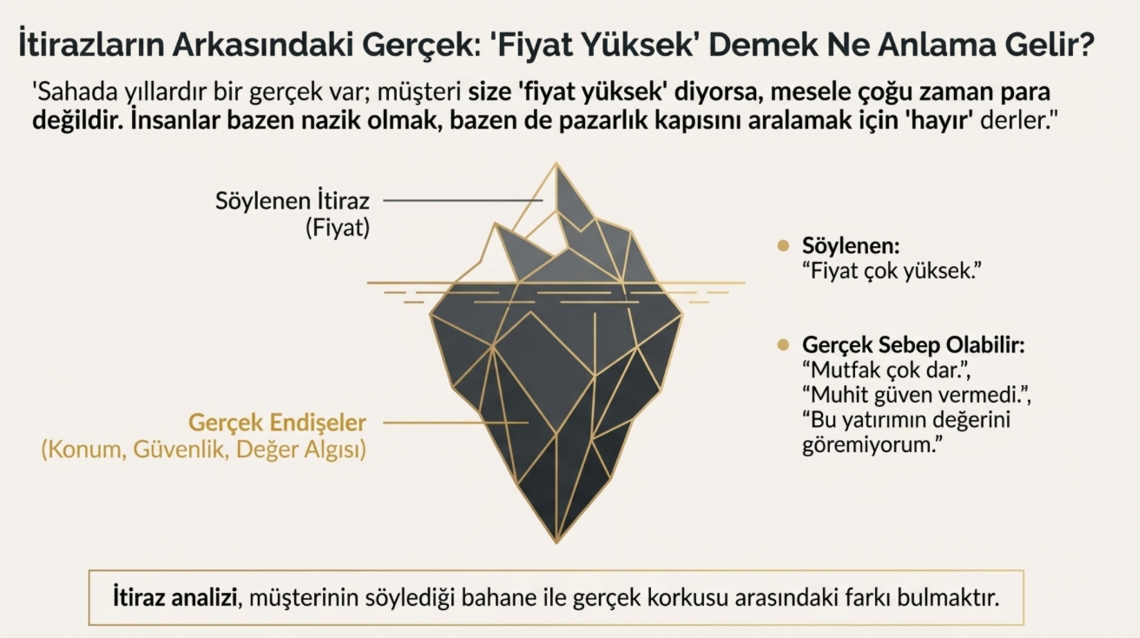 Sahada yıllardır bir gerçek var; müşteri size "fiyat yüksek" diyorsa, mesele çoğu zaman para değildir. Belki mutfağın darlığını sevmedi, belki muhit güven vermedi ama bunu söylemeye çekindi. İnsanlar bazen nazik olmak, bazen de pazarlık kapısını aralamak için "hayır" derler. İşte burada, Gayrimenkulde "Hayır"ı "Evet"e Çevirmek isteyen bir profesyonelin sezgileri devreye girer. Müşteriyi savunmaya geçirmeden, gerçek itirazı cımbızla çekip almak gerekir.