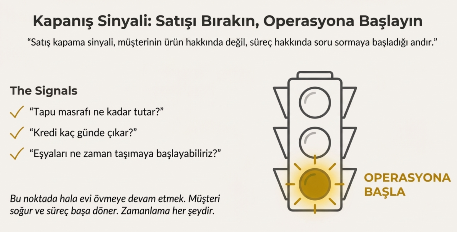 Müşteri artık mülkün özelliklerini sormayı bırakıp, süreci sormaya başladıysa satış kapanmak üzeredir. "Tapu masrafı ne kadar tutar?", "Kredi kaç günde çıkar?" gibi sorular, gizli birer "evet"tir. Bu noktada hala evi övmeye devam etmek, yapılan en büyük hatadır. Satışı geçip, operasyonu yönetmeye başlamak gerekir.