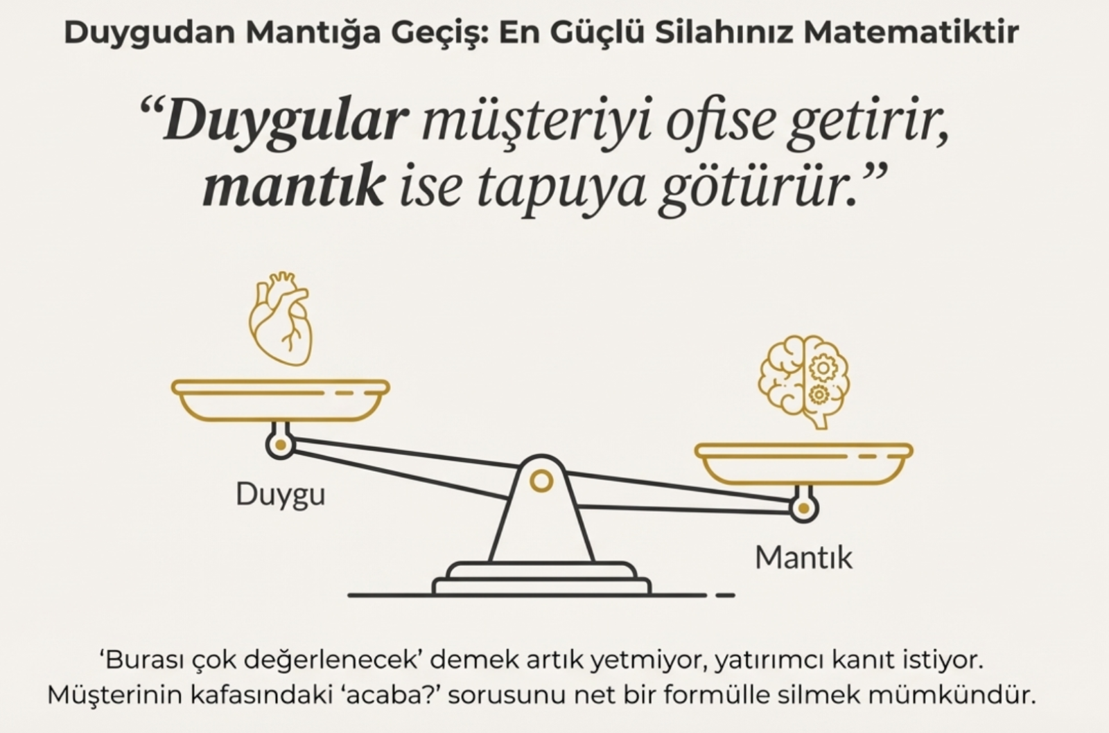 Duygular müşteriyi ofise getirir, mantık ise tapuya götürür. Gayrimenkulde "Hayır"ı "Evet"e Çevirmek sürecinde en güçlü silahınız matematiktir. "Burası çok değerlenecek" demek artık yetmiyor, yatırımcı kanıt istiyor. Özellikle arsa veya ticari mülk satışlarında, müşterinin kafasındaki "acaba?" sorusunu net bir formülle silmek mümkündür.