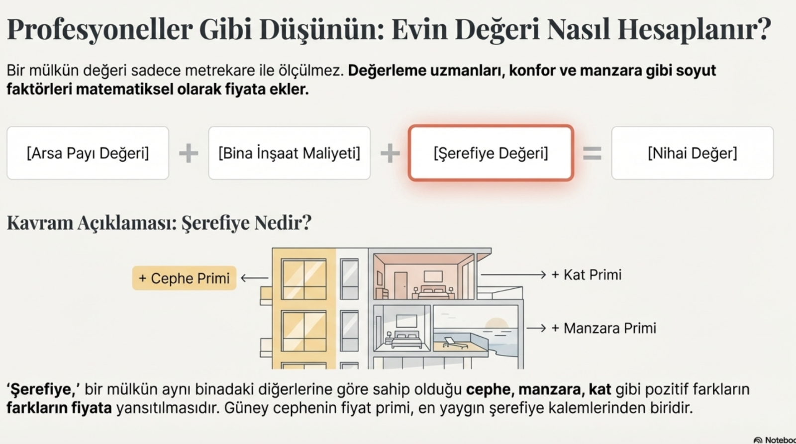 Evim ne kadar eder diye soran mülk sahiplerinin çoğu, evinin cephesinin fiyata etkisini hesaplamayı unutur veya abartır. Bir evin değerini belirlerken matematik basittir: Arsa Payı + Bina Maliyeti + Şerefiye (Cephe/Manzara).