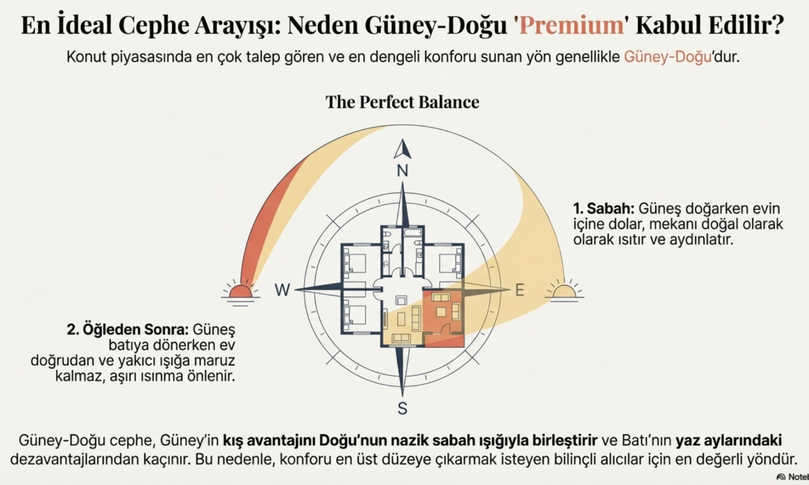 En iyi cephe hangisi sorusunun cevabı genellikle Güney-Doğu cephesidir. Sadece Güney değil, ara yönler de fiyatı değiştirir. Güney-Doğu cephe, sabah güneşini evin içine doldurur, evi ısıtır ve aydınlatır. Öğleden sonra güneş batıya döndüğünde ise eviniz aşırı sıcak olmaz. Özellikle konut alırken tapu ve imar uyumu kadar, cephenin çapraz açısı da önemlidir.