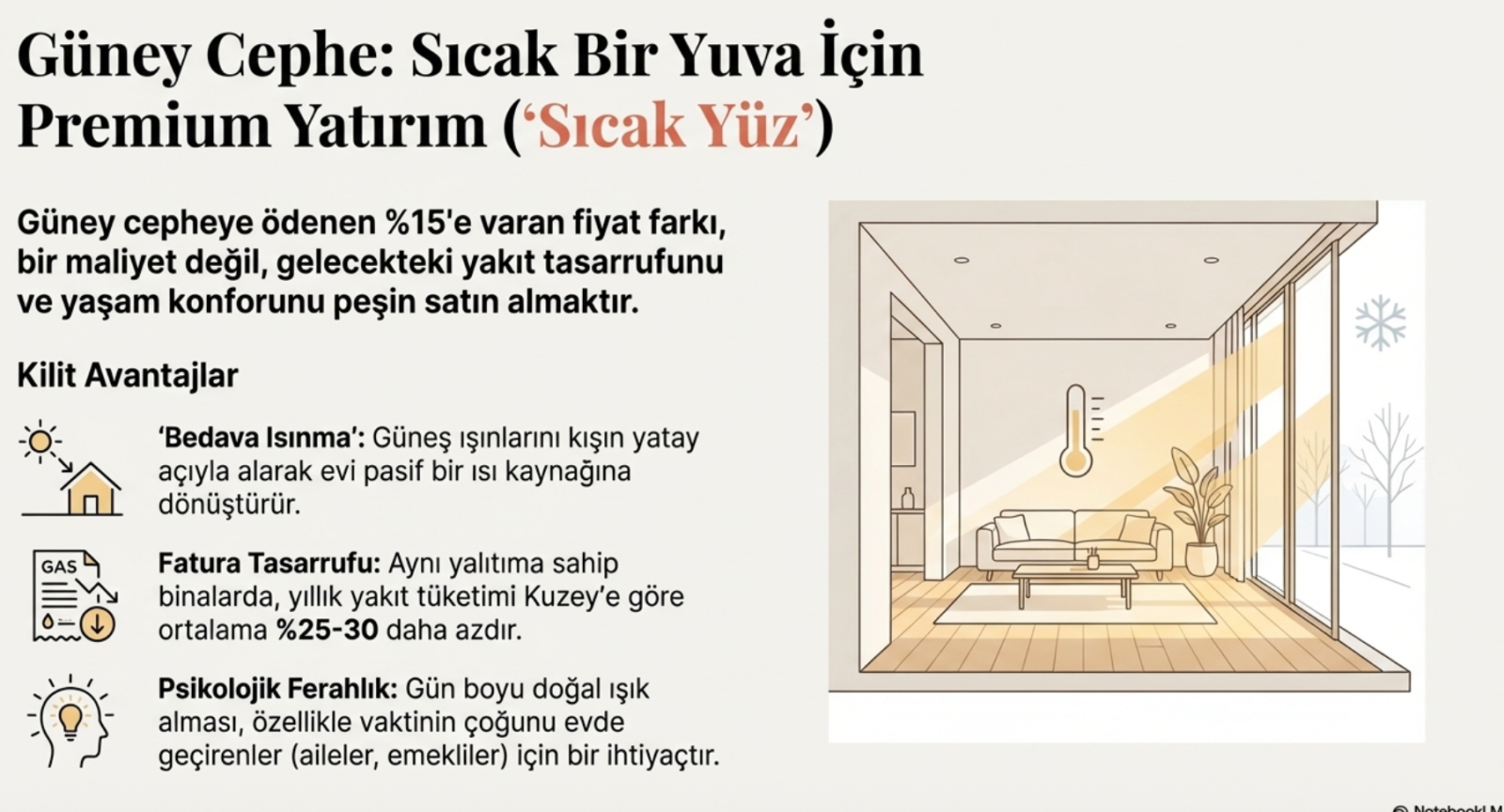 Doğalgaz faturası ne kadar gelir endişesi taşıyan alıcılar için güney cephe, evin en büyük tasarruf kalemidir. Türkiye gibi kış aylarının hissedildiği bir coğrafyada, güney cephe evler pasif bir ısı kaynağı gibi çalışır. Güneş ışınlarını yatay açıyla alan salon ve oturma odaları, kombiyi daha düşük derecede yakmanıza olanak tanır. İşte tam da bu "Bedava Isınma" avantajı nedeniyle, müteahhitler ve ev sahipleri güney cephe dairelerin fiyat etiketine %15'e varan bir "Konfor Farkı" (Şerefiye) eklerler. Bu farkı ödemek, aslında gelecekteki yakıt tasarrufunu peşin satın almak demektir.