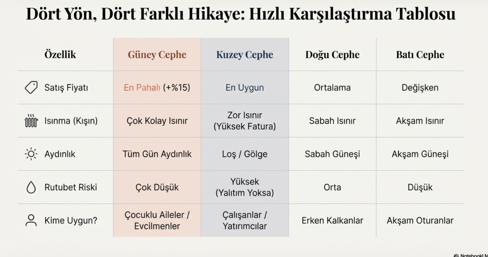 Evinizin baktığı yön, sadece fiyatı değil yaşam kalitenizi de belirler. İşte gerçek hayat verileriyle karşılaştırma: