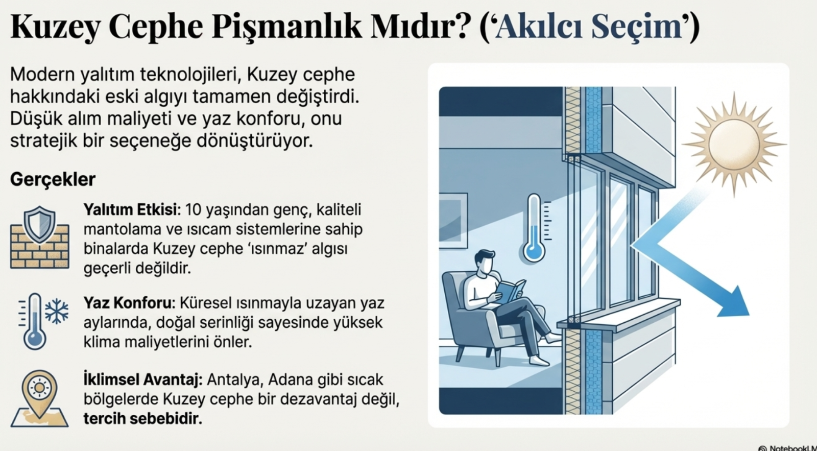 Kuzey cephe ev alınır mı, pişman olur muyum sorusu, bütçesi kısıtlı olan ev alıcılarının en büyük korkusudur. Eskiden yalıtımsız binalarda kuzey cephe demek "rutubet ve soğuk" demekti. Ancak yeni nesil mantolama sistemleri ve kaliteli ısıcam teknolojileri sayesinde bu makas kapandı. Eğer bina 10 yaşından gençse ve ısı yalıtımı (mantolama) kaliteliyse, kuzey cephe ev gayet iyi ısınır.