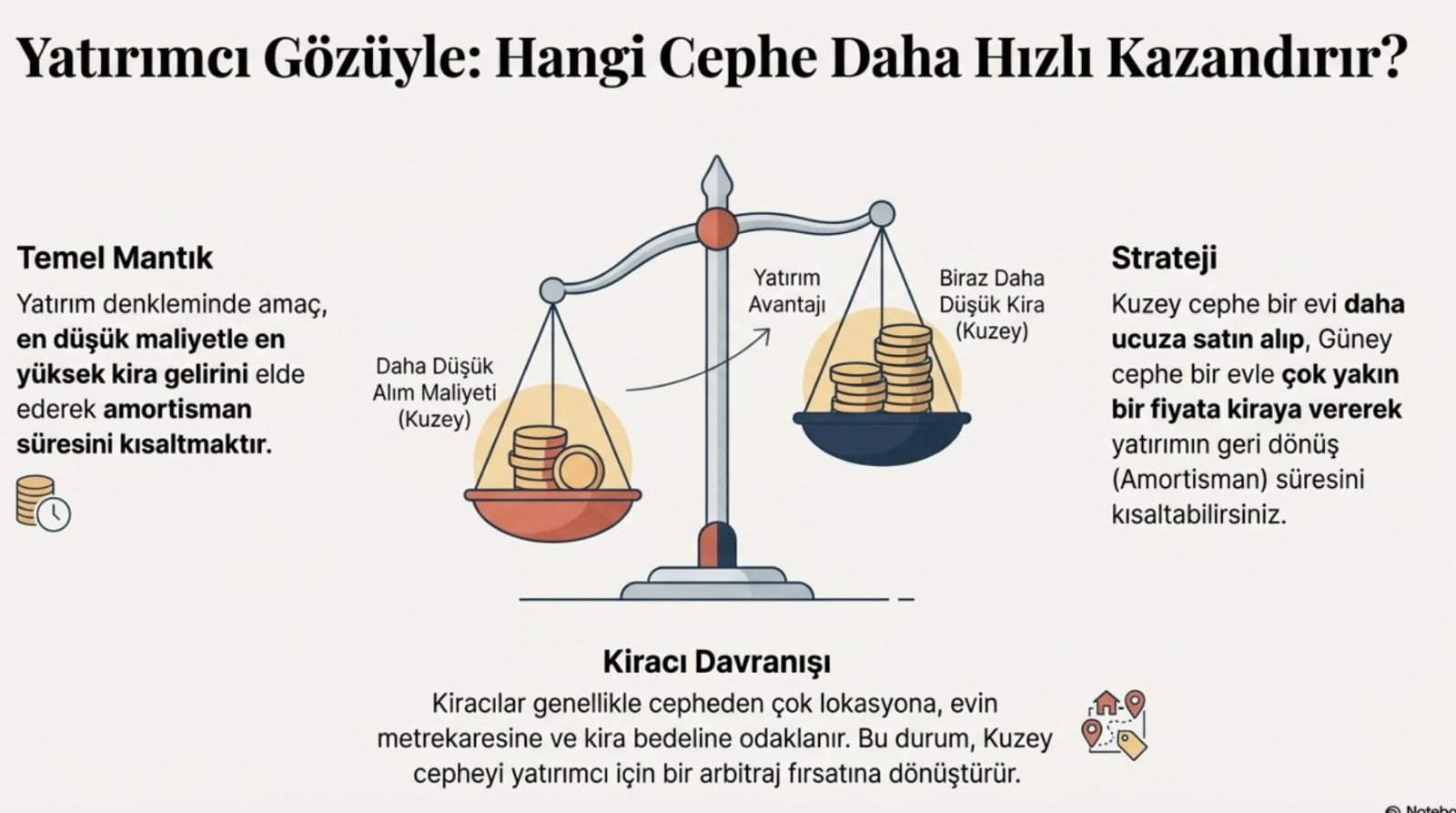 Kiraya vermek için ev alacağım diyen yatırımcılar için denklem biraz farklı işler. Kiracılar genellikle evin cephesinden ziyade lokasyonuna, içine ve kirasına bakarlar. Kuzey cephe bir evi daha ucuza satın alıp, güney cephe bir evle aynı veya çok yakın fiyata kiraya verebilirsiniz. Bu durumda, cebinizden daha az para çıktığı için yatırımın geri dönüş süresi (Amortisman) kısalır.