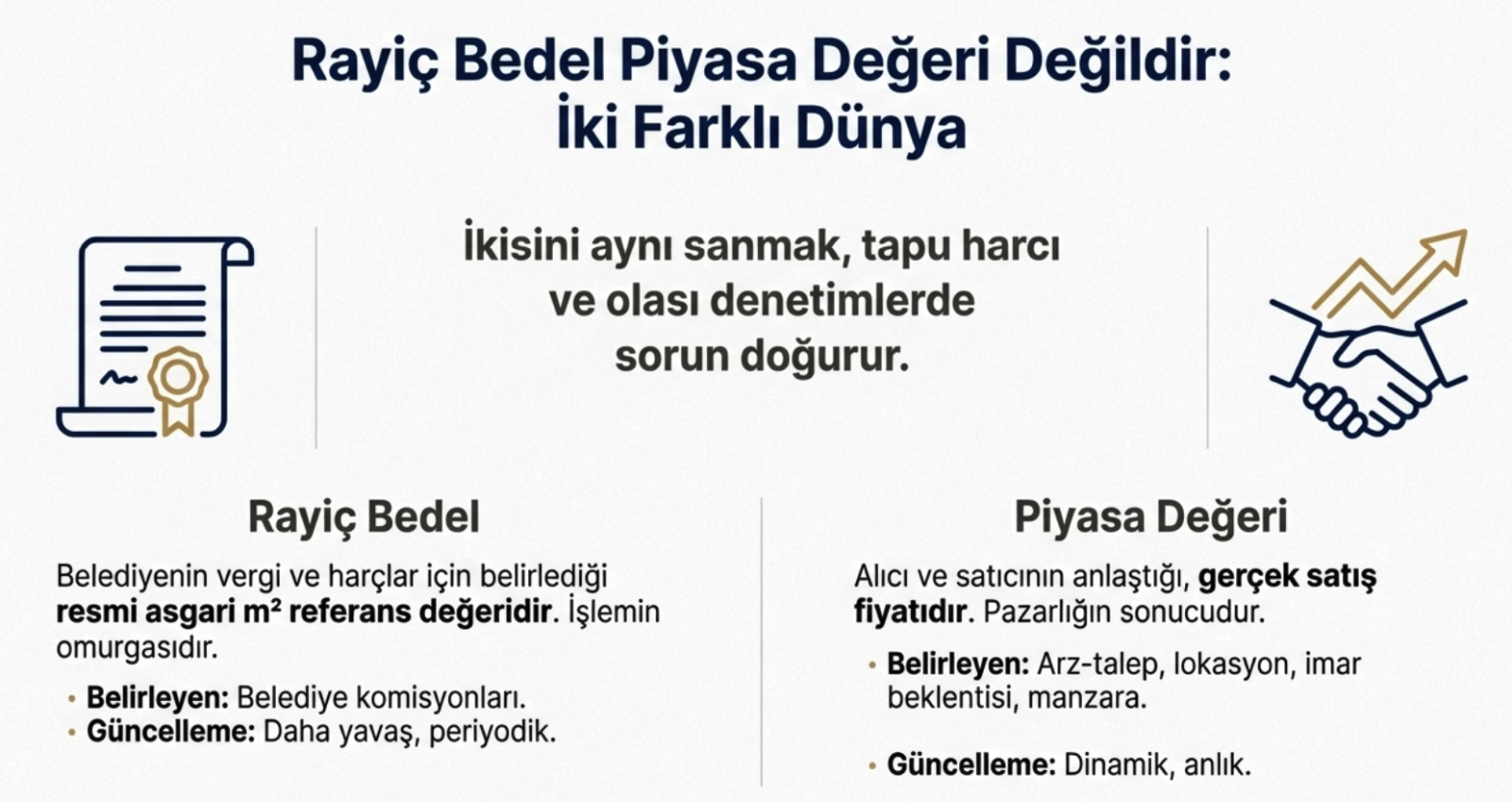 Rayiç bedeli, “yanlış anlaşılırsa” yatırımın freni olur. Ancak belediye rayiç bedeli doğru alınıp dosyaya konursa süreç hızlanır. Yatırım etkisi: alıcı güveni artar, satıcıyla pazarlık daha temiz zeminde yapılır, tapu günü sürpriz azalır.