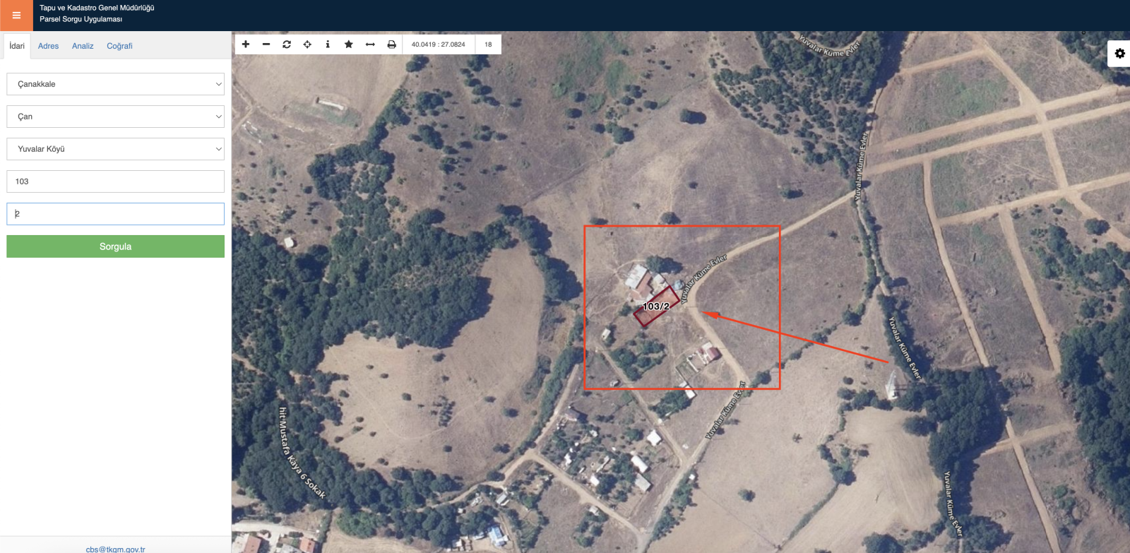 Tarlanın Kadastrol Yol ve Ulaşım durumunu Tapu ve Kadastro Genel Müdürlüğü Parsel Sorgu Uygulaması üzerinden yapabilirsiniz. Aşağıdaki görselde ok işareti ile belirtilen kısım kadastrol yoldur.