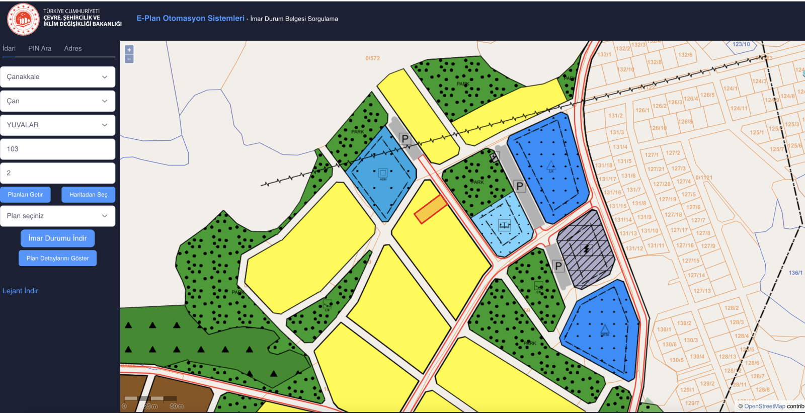 İmar plan sorgulamak için ilgili belediyenin e-imar sayfasından ada ve parsel bilgisi girerek görebilirsiniz. Örnek Çanakkale e imar sayfasına ulaşabilirsiniz.