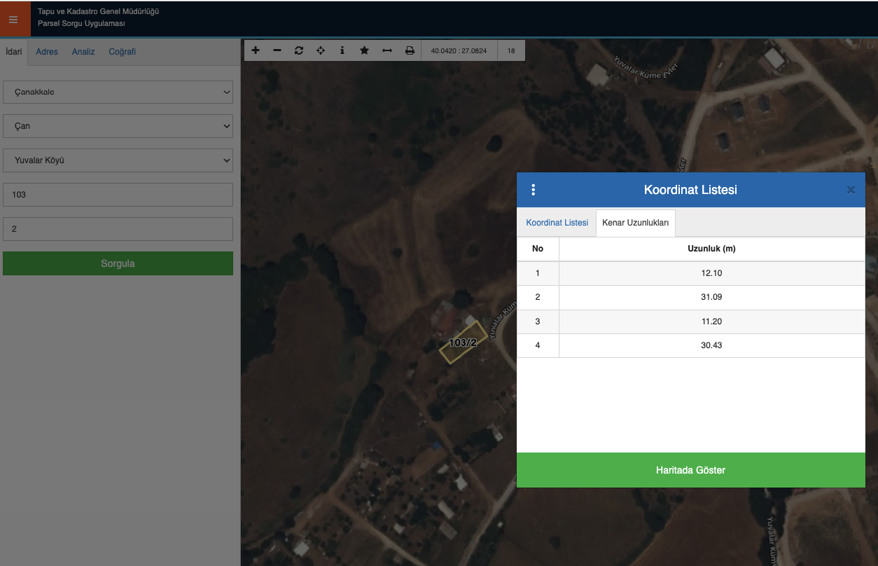Koordinat listesi menüsündeki "Kenar Uzunlukları" sekmesi, arazinin yola veya komşuya olan her bir cephesini metre cinsinden (örneğin 31.09m) net olarak gösterir.