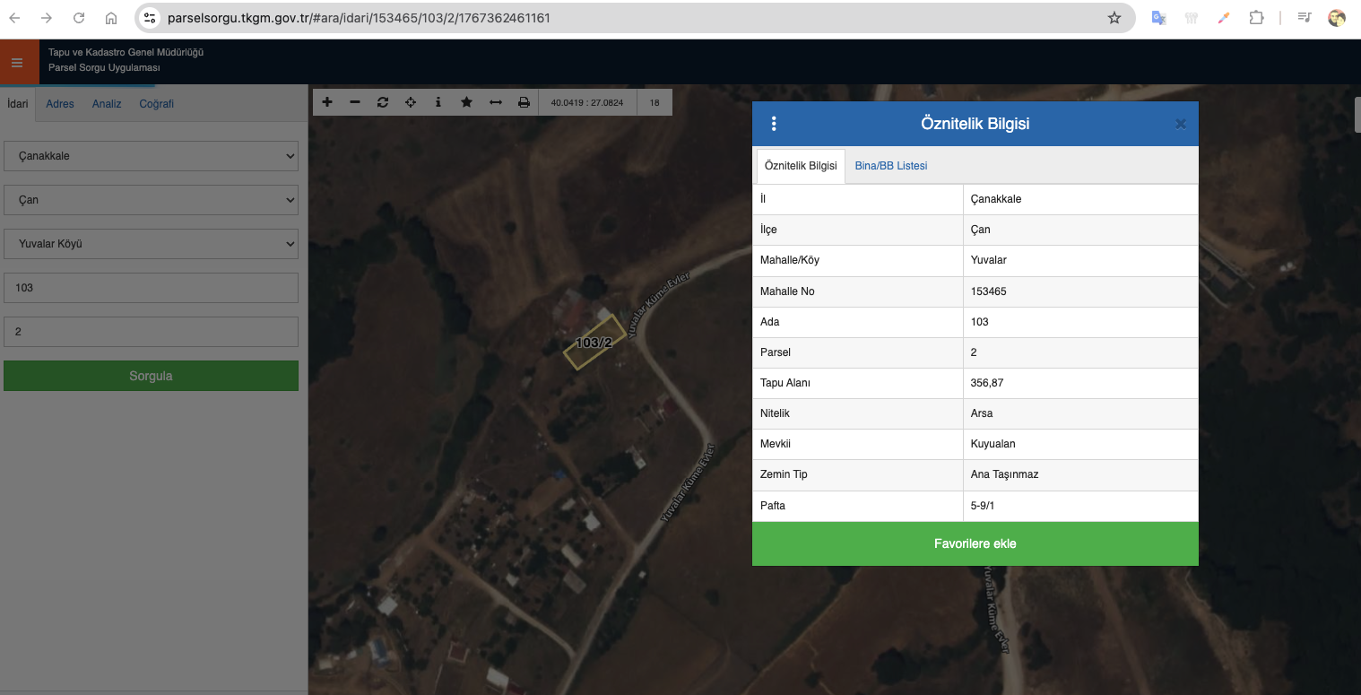 Sorgulama ekranında parseli bulduğunuzda, sağ alt köşede veya bilgi panelinde koordinat verilerine ulaşabilirsiniz. Bu koordinatları profesyonel bir GPS cihazına veya gelişmiş harita uygulamalarına girerek sahada nokta tespiti yapabilirsiniz.