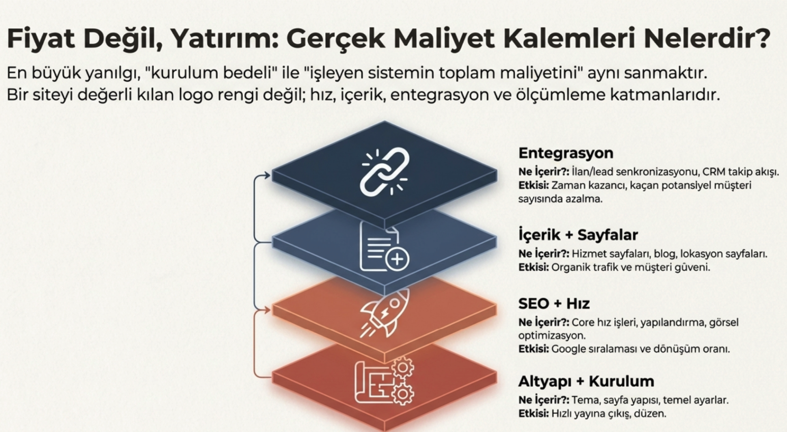 Emlak web sitesi fiyatı tek bir etiket değildir; kurulum + içerik + hız + entegrasyon toplamıdır. Ancak içerik bütçesi sıfırsa “site var ama görünmüyor” döngüsü başlar. Doğru bütçe, 3–6 ayda organik talebi artırarak yatırım etkisi üretir.