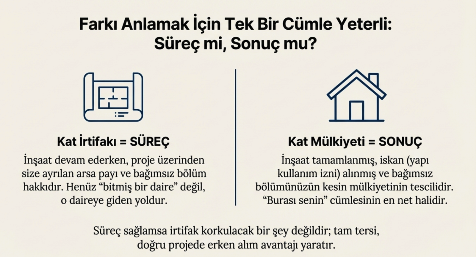 Kat mülkiyeti, iskanı alınmış ve projesi tam onaylanmış yapıyı temsil ederken; kat irtifakı, yapım sürecindeki veya iskanı eksik yapıyı ifade eder. Yatırımcı için kat mülkiyeti "sıfır risk", kat irtifakı ise "potansiyel risk ancak yüksek getiri" demektir.