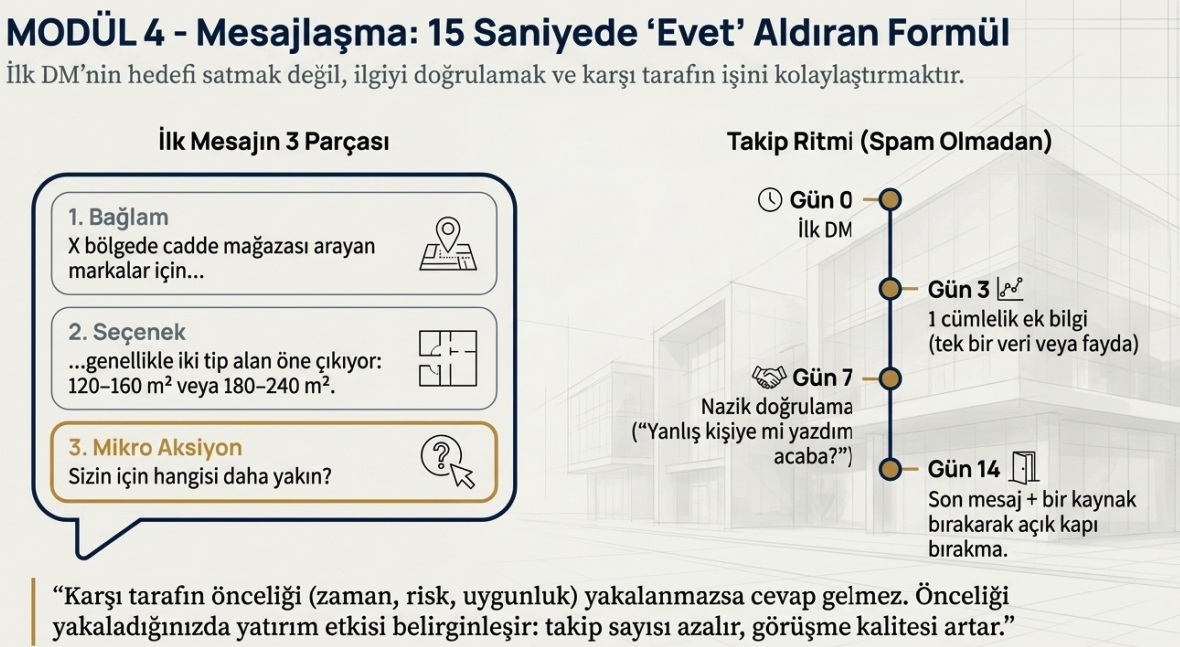 Mikro senaryo: “Perakende genişleme yöneticisi”ne yazıyorsunuz. “Merhaba, portföyüm var” mesajı çöpe gider. Onun yerine bağlam verirsiniz: “X bölgede cadde mağazası arayan markalar için…” Sonra iki seçenek sunarsınız: “120–160 m² / 180–240 m²” gibi. Mikro aksiyon da tek sorudur: “Hangisi daha yakın?”