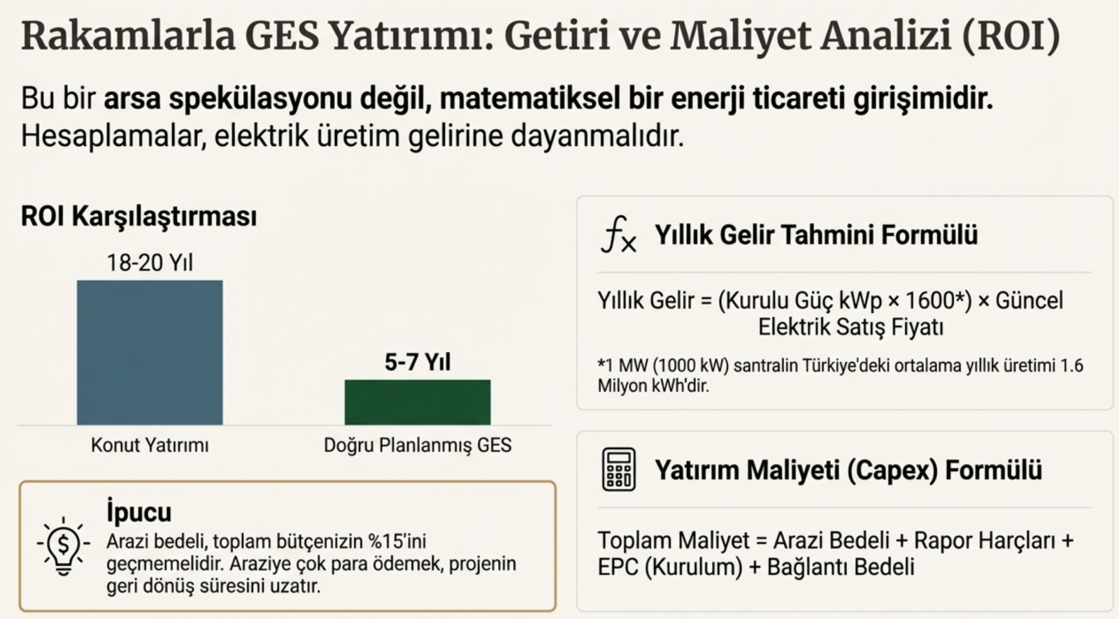 GES yatırımı, duygusal değil matematiksel bir "enerji ticareti" girişimidir. Hesaplama yaparken arsa değer artışını değil, elektrik üretim gelirini baz almalısınız.