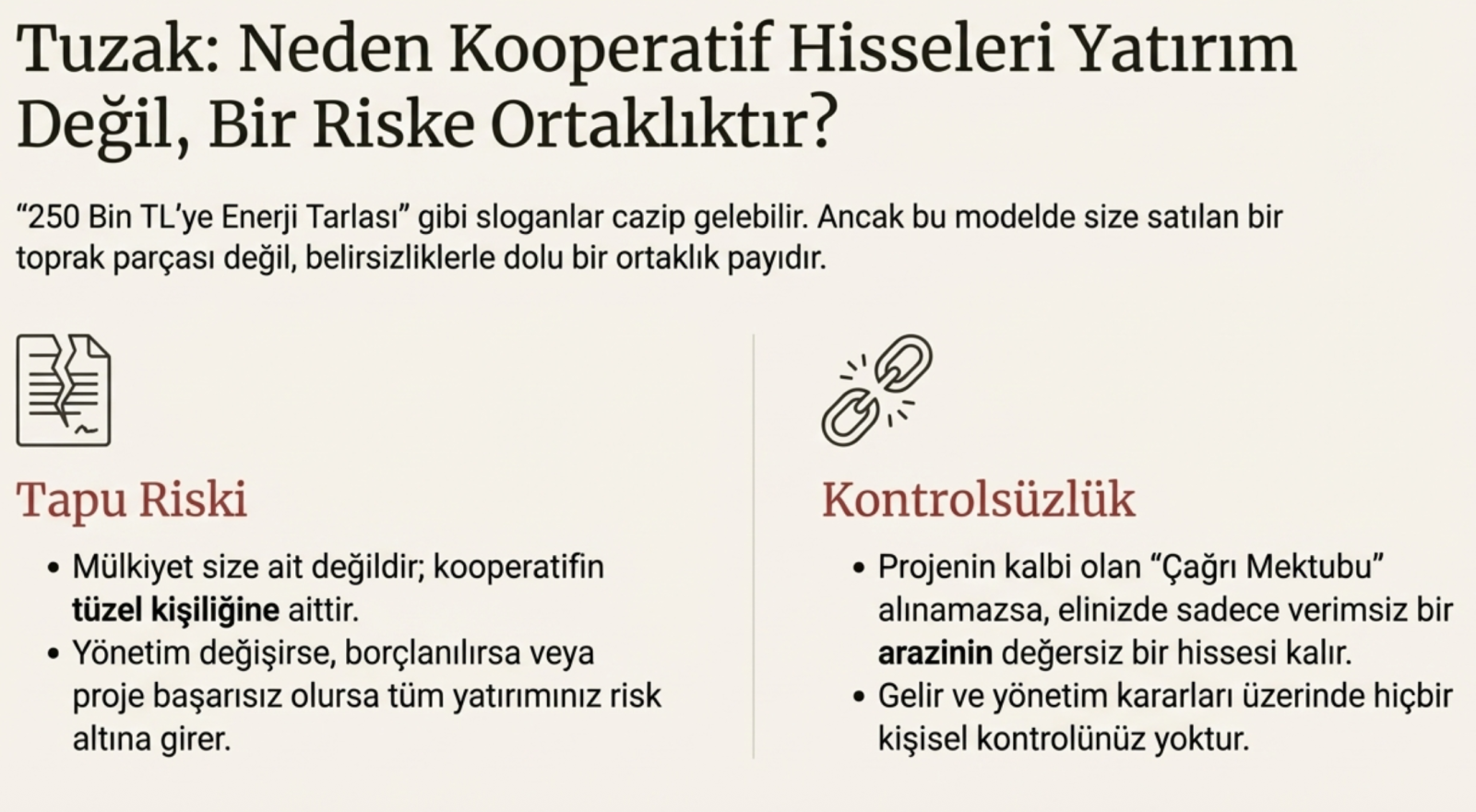 - Tapu Riski: Tapu sizin adınıza çıkmaz. Kooperatif yönetimi değişirse, santral kurulamazsa veya borçlanılırsa, sizin hisseniz riske girer.