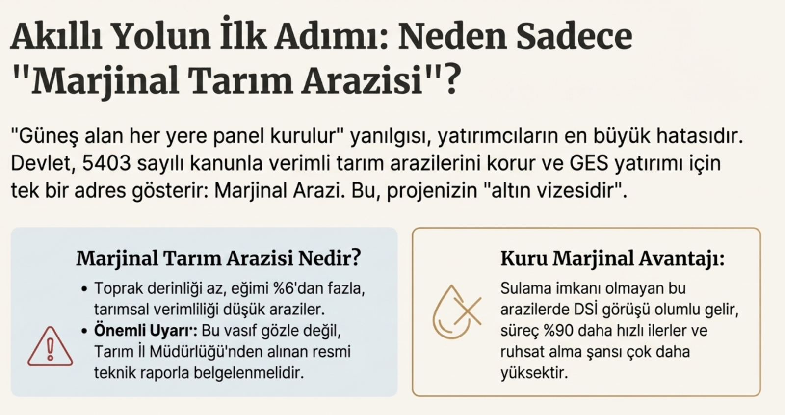 Yatırımcıların sahada en çok yanıldığı nokta, "güneş alan her yere panel kurulur" düşüncesidir. Oysa Türkiye'de tarım arazilerini korumak için 5403 sayılı kanun çok nettir. Devlet, "Mutlak Tarım" arazisine panel gölgesi düşürmez. GES kurabilmek için arazinin resmen "Marjinal Tarım Arazisi" statüsünde olması gerekir.