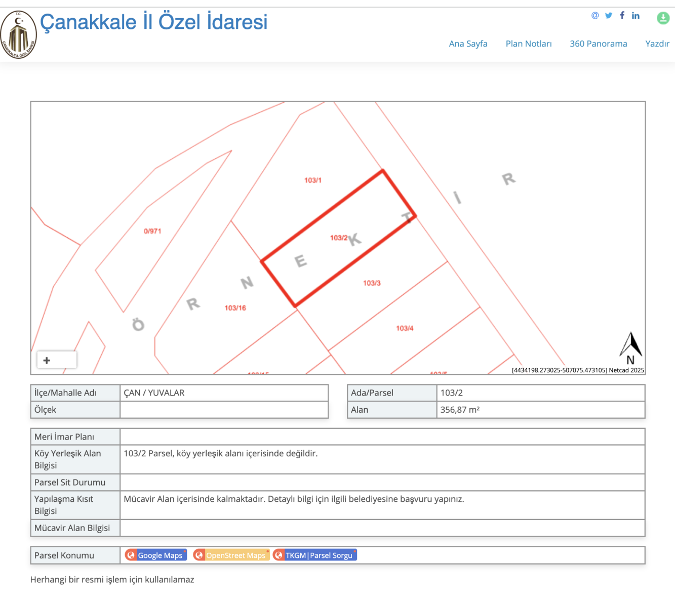 Aşağıdaki görselde gireceğiiniz parsel ve ada bilgisine göre detayları incelebilirsiniz. Çevre Şehircilik ve İklim Değişiklik Bakanlığı sayfasından sorgulama yapabilirsiniz.